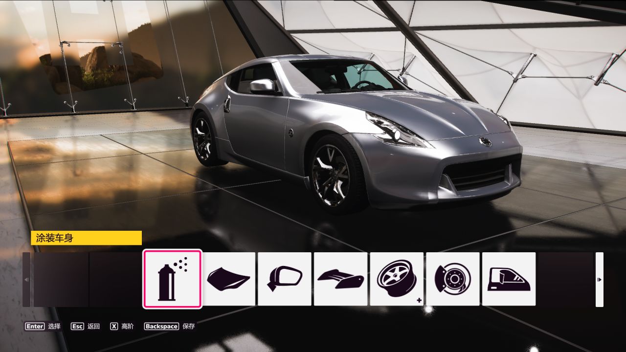 在車庫主頁選擇 設計與塗裝 - 塗裝車輛 - 塗裝車身,改變車身顏色並依次保存到當前車輛即可.