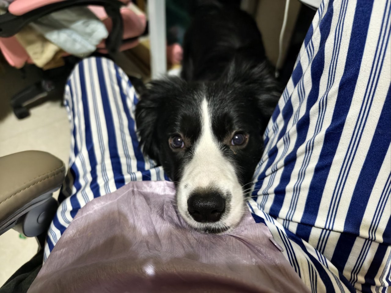 我居家办公时,千喜就老老实实在一边自己玩,但也会偶尔突然跑过来让我摸摸头,不给摸头就嘤嘤嘤,还好不是驴叫。