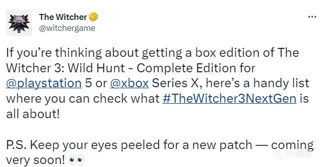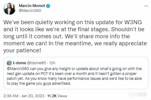 在关于补丁更新的准确时间上,CDPR 的全球社区总监 Marcin Momot 表示不会是本周,可能是下周,具体更新内容暂不可知: