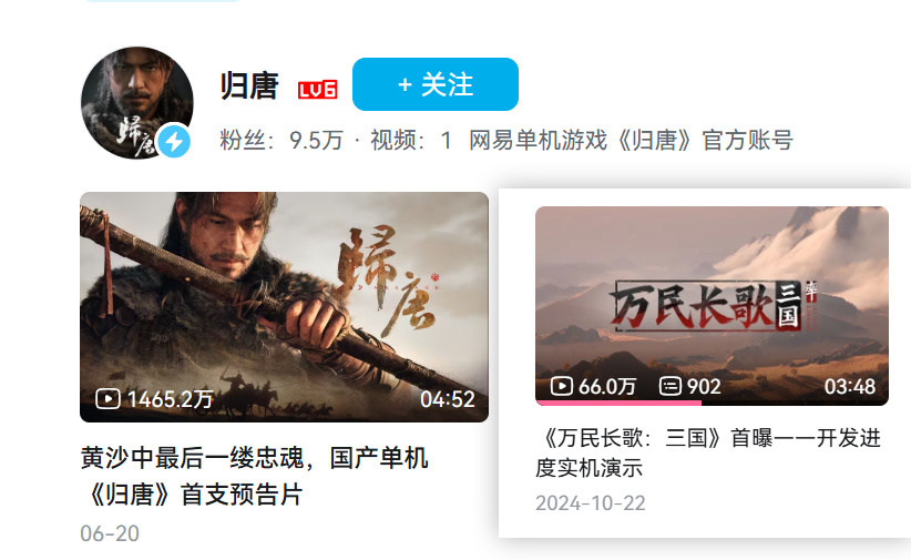 与之对比的归唐发布至今,号称单机,却并没有任何单机出现,也是神了,这两播放量和粉丝对比实在夸张: