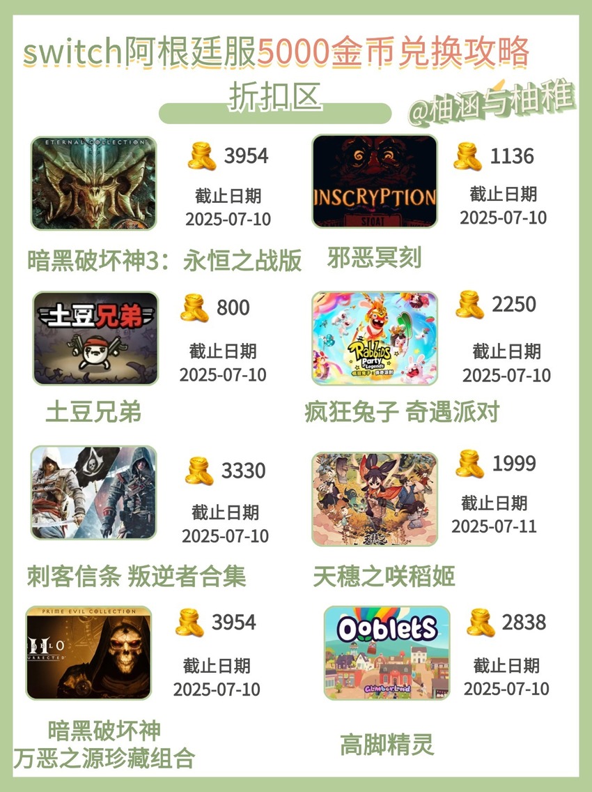 本週基本上能夠滿足幾乎所有玩家的胃口啦,暗黑、刺客信條、茶杯頭、Ori都有,聚會類的瘋狂兔子:派對奇遇,地產大亨瘋樂等都已可以進行兌換,這周是放了大福利了,有剩餘金幣的玩家儘快兌換啦!