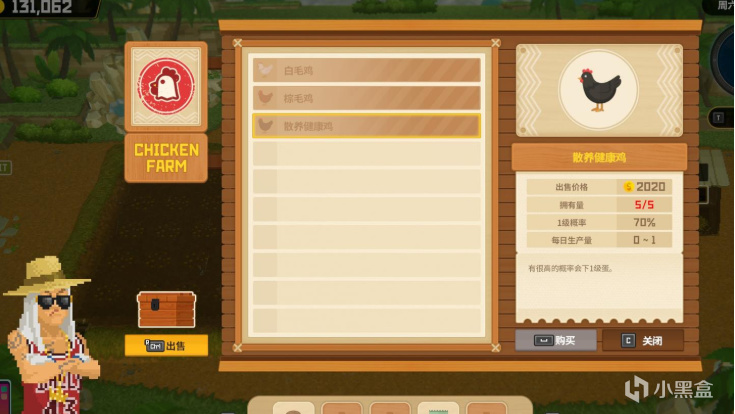 有三中价位的鸡,可以买,每种上线是5只,最高等级的健康鸡可以高概率产出一级蛋,实际产量在3-4个左右,最低等级的白毛鸡是给普通鸡蛋,买了一直有,不过收益比较低,发力很晚,前中期买一个白毛鸡过任务即可。