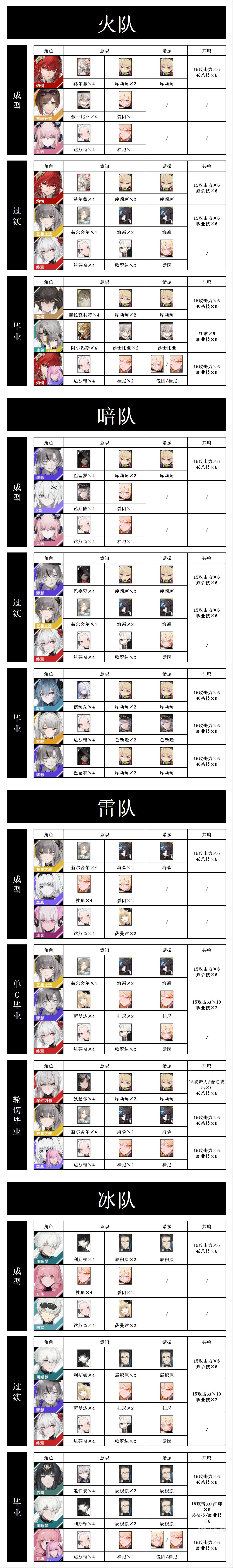 本文旨在帮助萌新了解阵容与意识搭配逻辑,每个队伍基本给出①低配单c成型、②轮切毕业、③更多搭配三种情况的搭配,部分极端情况所使用的意识搭配并未收录。轻度玩家只需要看“成型”和“毕业”两个板块就行,“更多搭配”中收录一些竞速or特殊搭配,有兴趣可以了解一下。