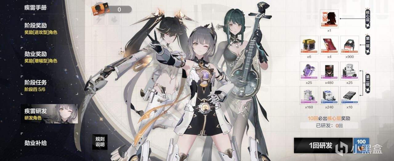 疾雷研发(疾雷手册中的卡池):采用层级抽取方式(每次研发消耗【循星研发券】,且消耗递增:100/250/400/750/1000/1500/2000/2500/3000/3500),第五抽之后才有机会抽到机体自选箱,包含截至七实芒星之迹的所有机体,可视为玩家的第二自选卡池。官方赠送的研发券也可在此使用。