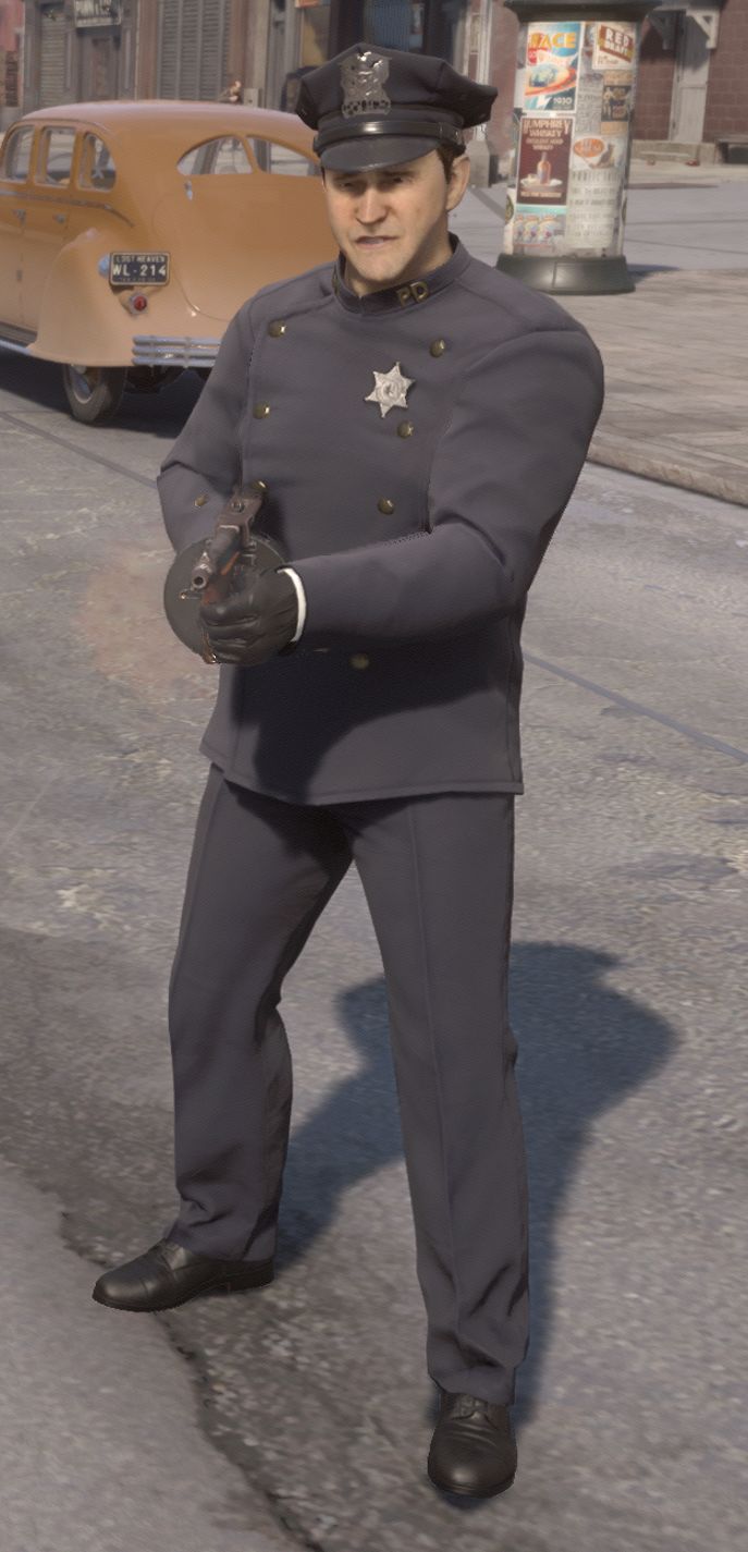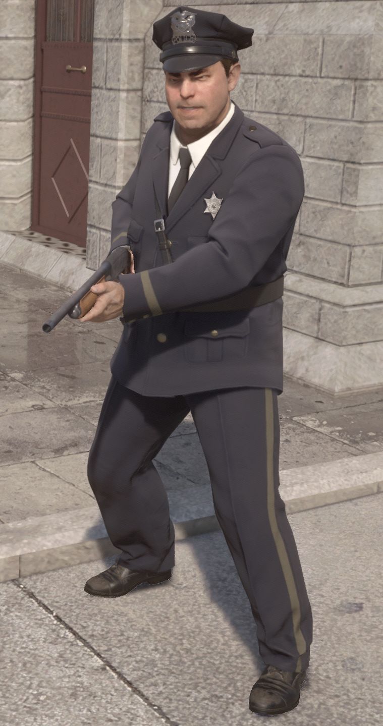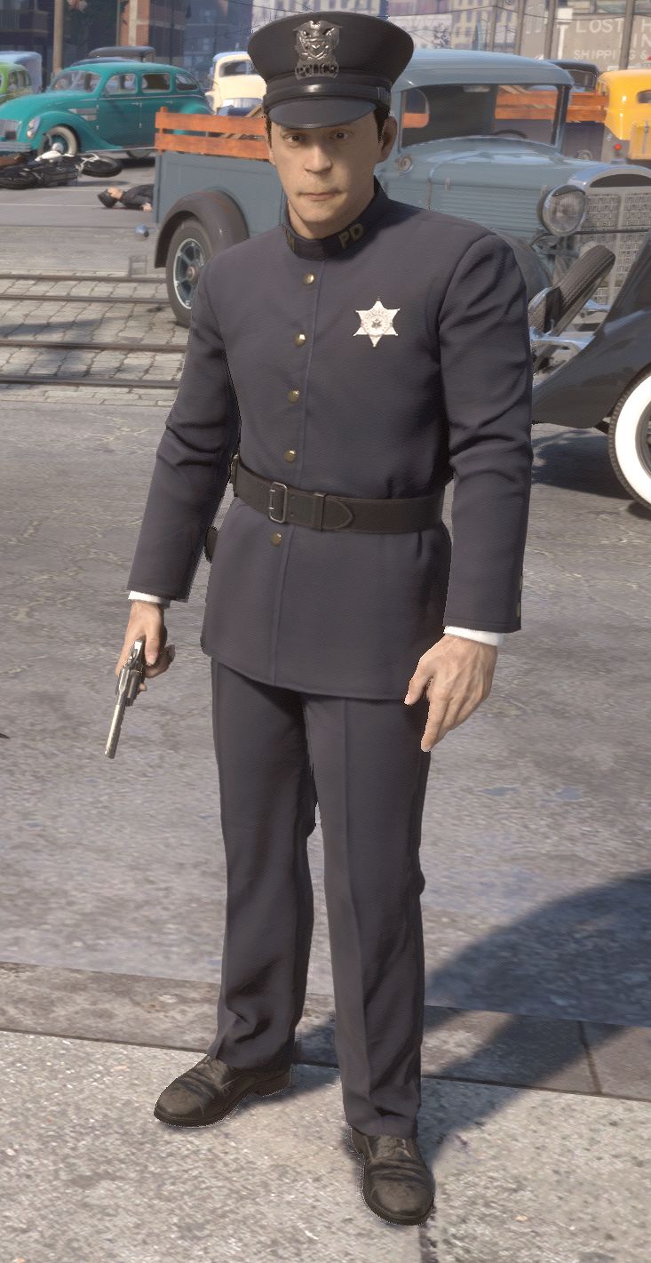 現在你面對的這些警察都是街頭上最常見的角色,街頭巡邏有他們,在集市上把鬧事的愛爾蘭酒鬼拖走也是他們,這些人是失落天堂警察局構成的基礎部分,這種普通巡警穿着都是一身黑,黑色的大檐帽,黑色的制服與褲子,黑色的警用皮帶,皮帶上還掛着槍套和手槍子彈鏈。