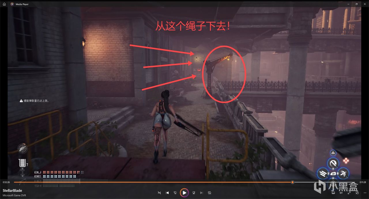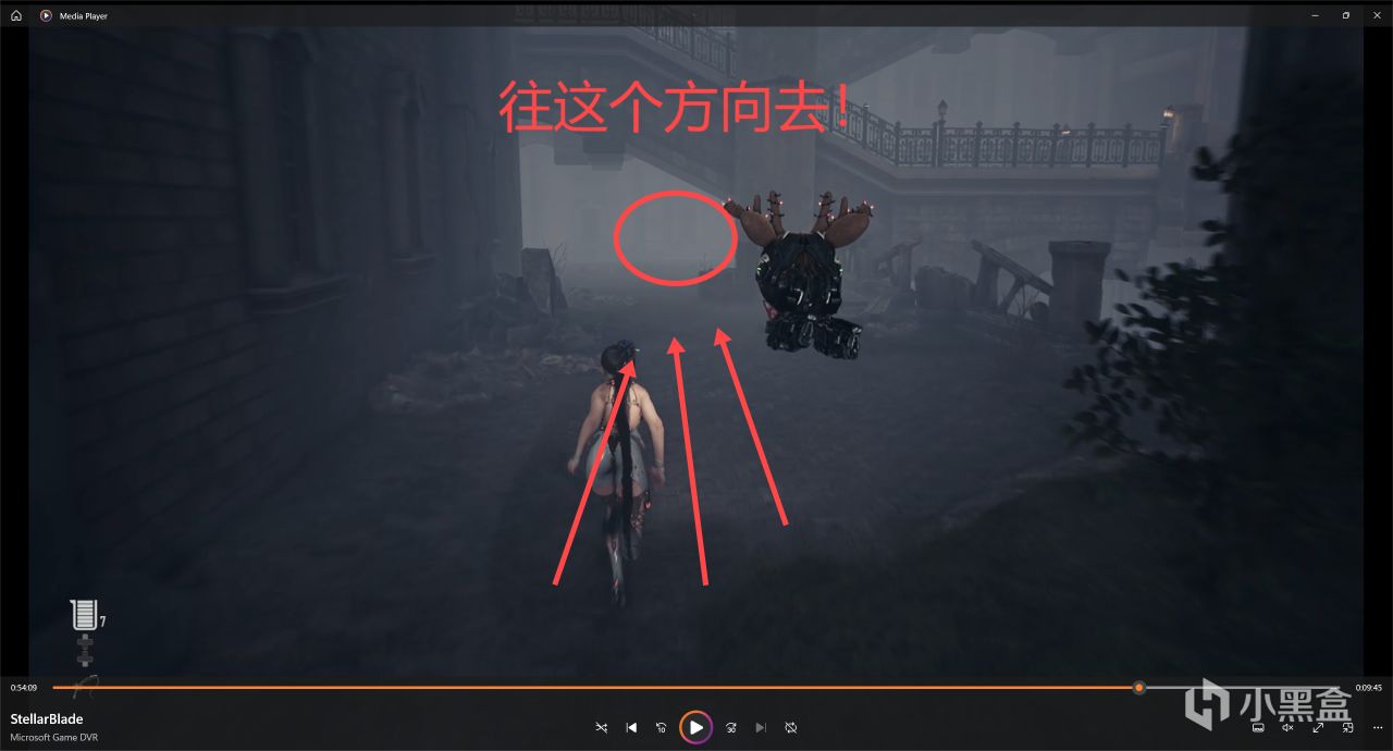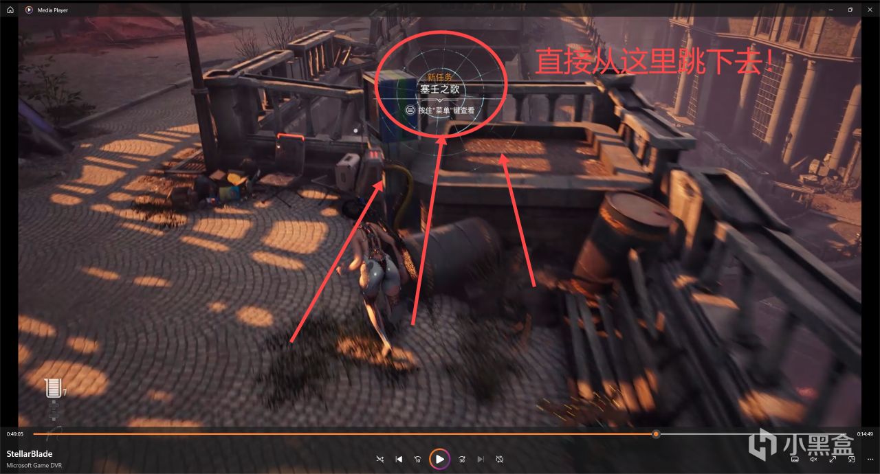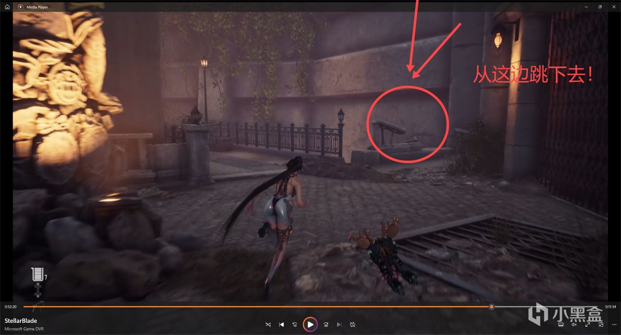 然後我們原路返回,回到剛剛接取【終結噩夢】的地方,我們往反方向走,然後從右邊圈圈的地方跳下去!