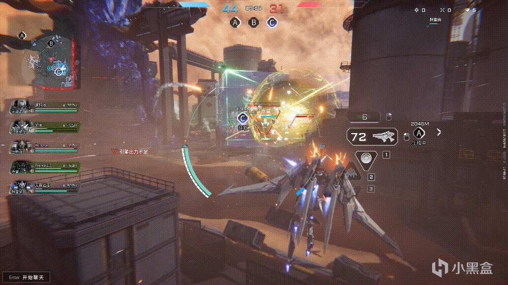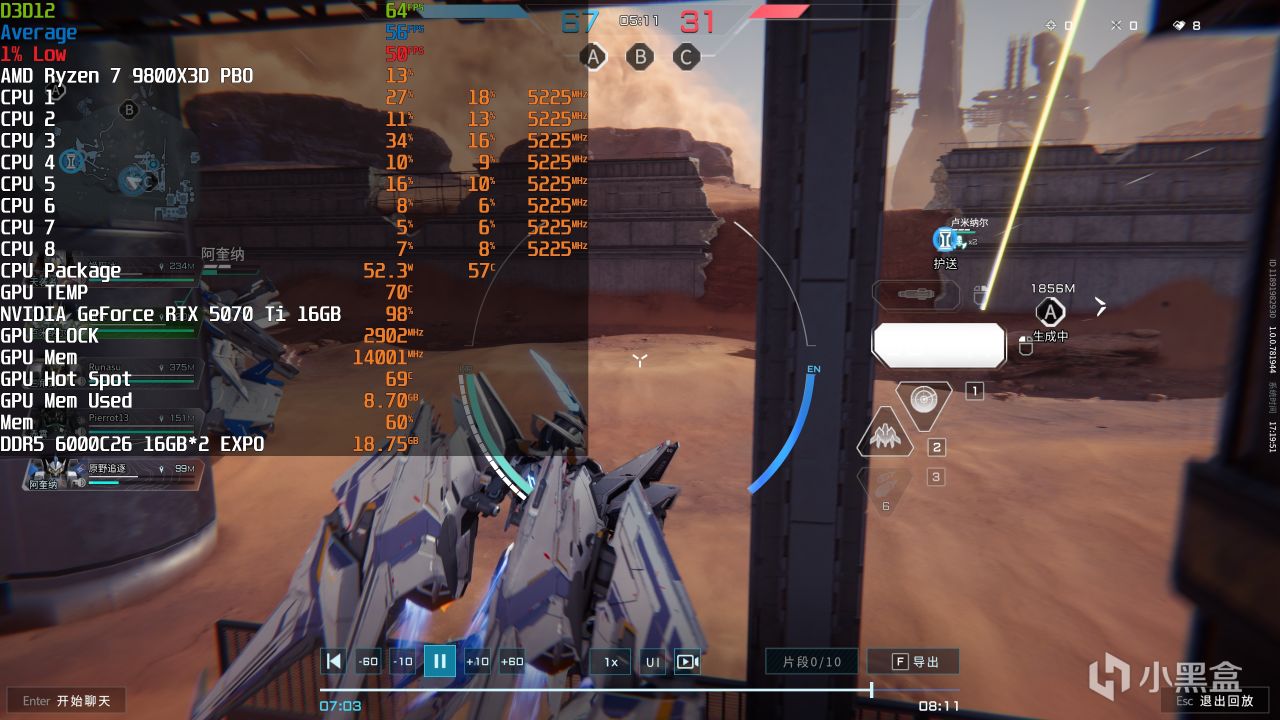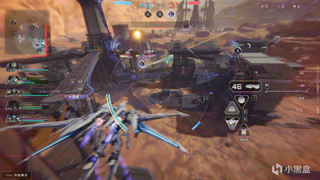 測試場景方面,《解限機》雖沒有基準,但有回放系統就挺方便測試。這裏選擇了邊緣戰場模式中的密斯之眼(6V6 PVP)作爲測試樣本,選擇機體是矛隼,大致流程是這樣:在搶據點的時候切換矛隼形態,來回使用速射炮、輕重型導彈進行多個來回騷擾,此時視角會在空中,視距也會比較遠。