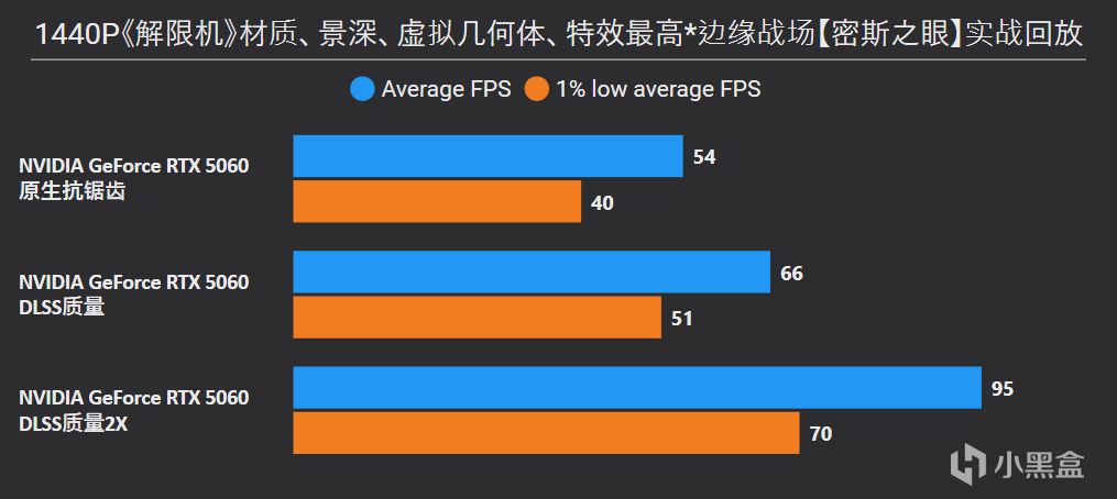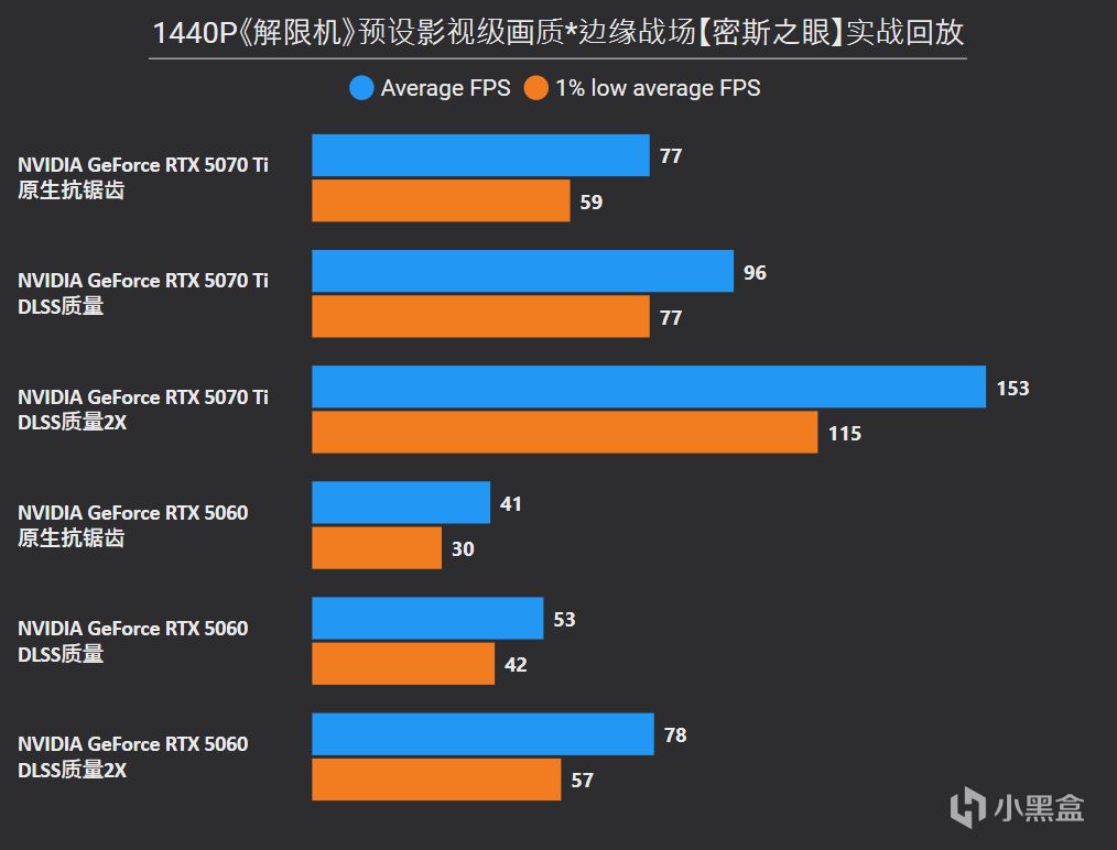 2K分辨率,原生抗鋸齒RTX 5060已經沒戲,藉助DLSS質量檔纔可達到平均53fps,1%幀只有42fps體現在玩家扎堆放技能的時候,若不想降畫質只能依靠2X幀生成,達到平均78fps尚可接受吧。
