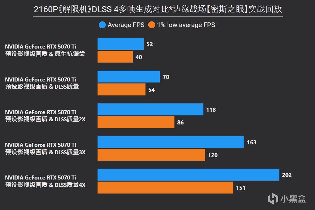 DLSS 4多幀生成方面,就以RTX 5070 Ti運行4K分辨率爲例,原始幀依賴DLSS質量檔就可達到70fps可以保障低延遲跟手一點,此時開啓DLSS 4的2X倍率後,提升幅度相比影視級原生抗鋸齒有2.26倍,3X倍率是3.13倍,最後4X倍率是3.88倍。