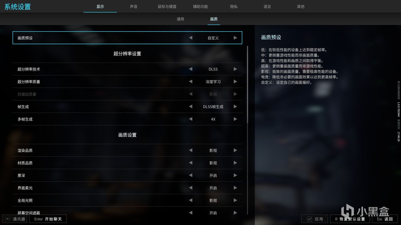 《解限機》UI首頁設計說實話挺像頁遊的,進入系統設置後的畫質選項也就還好,風格比較簡潔,想要開啓DLSS幀生成切記先把API切換至DX12,DLSS分爲自動、深度學習(DLAA)、質量、平衡、性能和最高性能這些檔位。