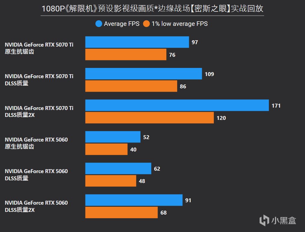 主流1080P分辨率,原生抗鋸齒下RTX 5060平均跑到52fps,居然只是勉強流暢水平,有DLSS質量檔加持纔可保穩60fps+。而RTX 5070 Ti則是剛好達標高刷門檻——DLSS質量檔下能有平均109fps,此時再使用2X幀生成就很舒坦了。
