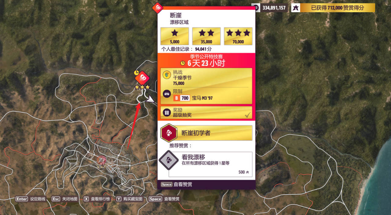 漂移區域:斷崖,完成獎勵爲超級抽獎。(建議從箭頭所指處出發,漂移調校:102 843 838,左右扭扭注意別出路界)