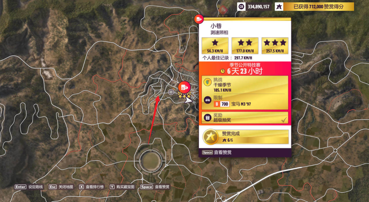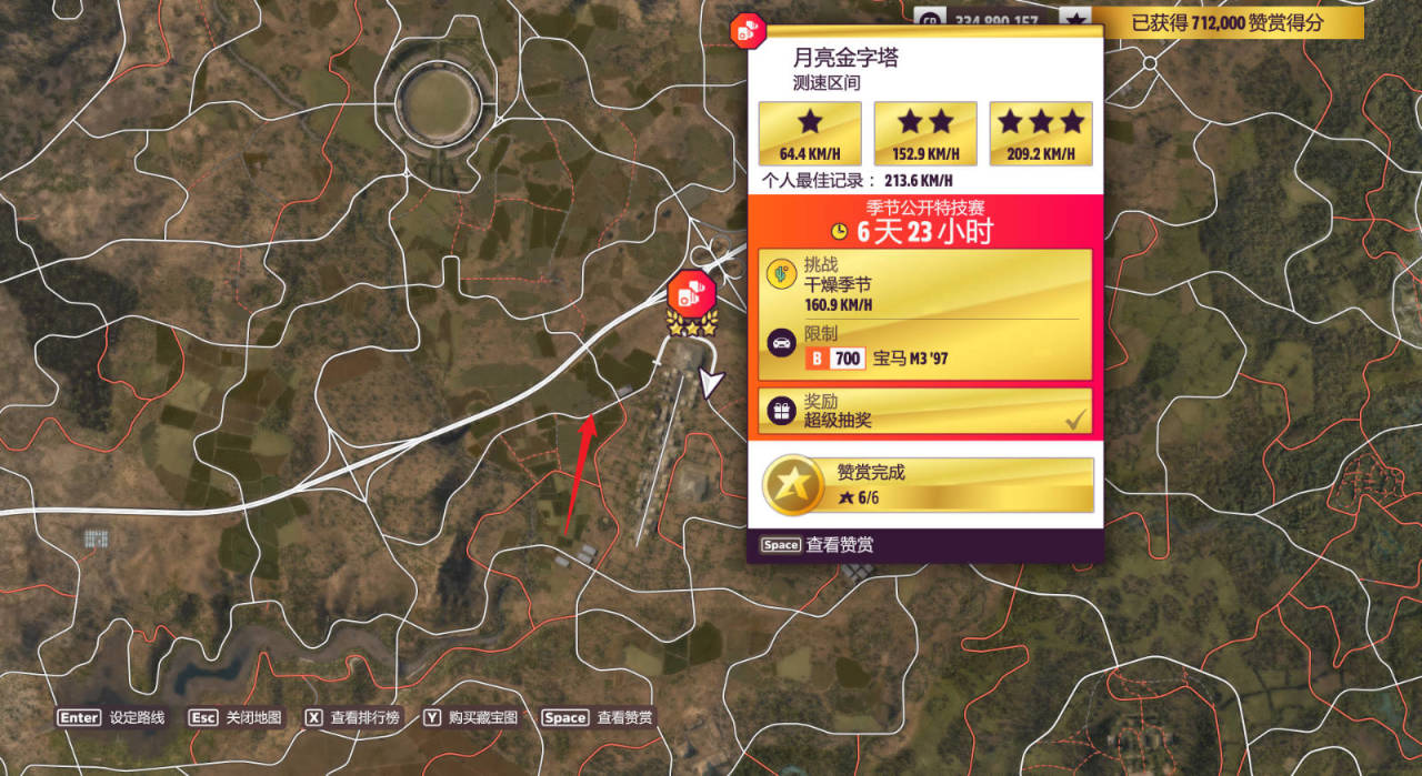 測速區間:月亮金字塔,完成獎勵爲超級抽獎(建議從箭頭所指處出發兩個彎要切最外圈,不要剎車全程鬆油門就能過)