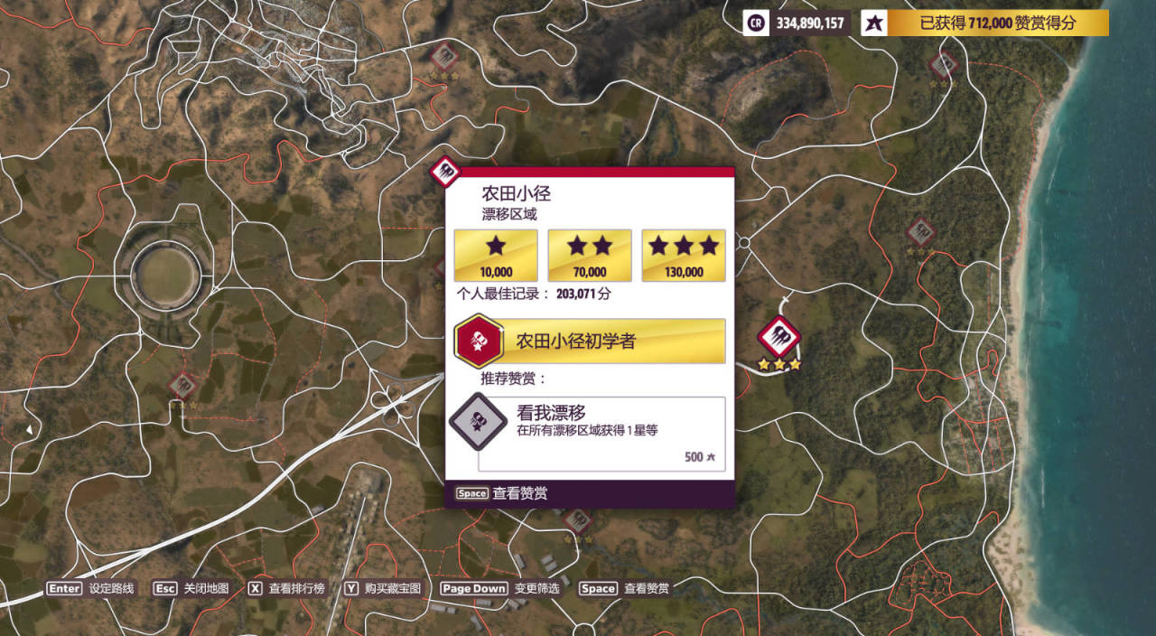 在農田小徑漂移區域獲得3星等(位置如圖,可以用上面馬拉松挑戰的日產370Z,正好提供了漂移調校,左右扭扭別出界就行)