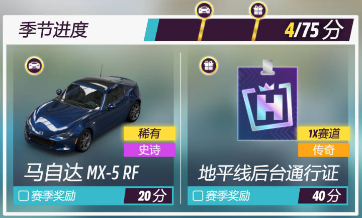 冬季賽20分進度獎勵爲2022款馬自達 MX-5 MIATA RF和40分進度獎勵爲地平線後臺通行證