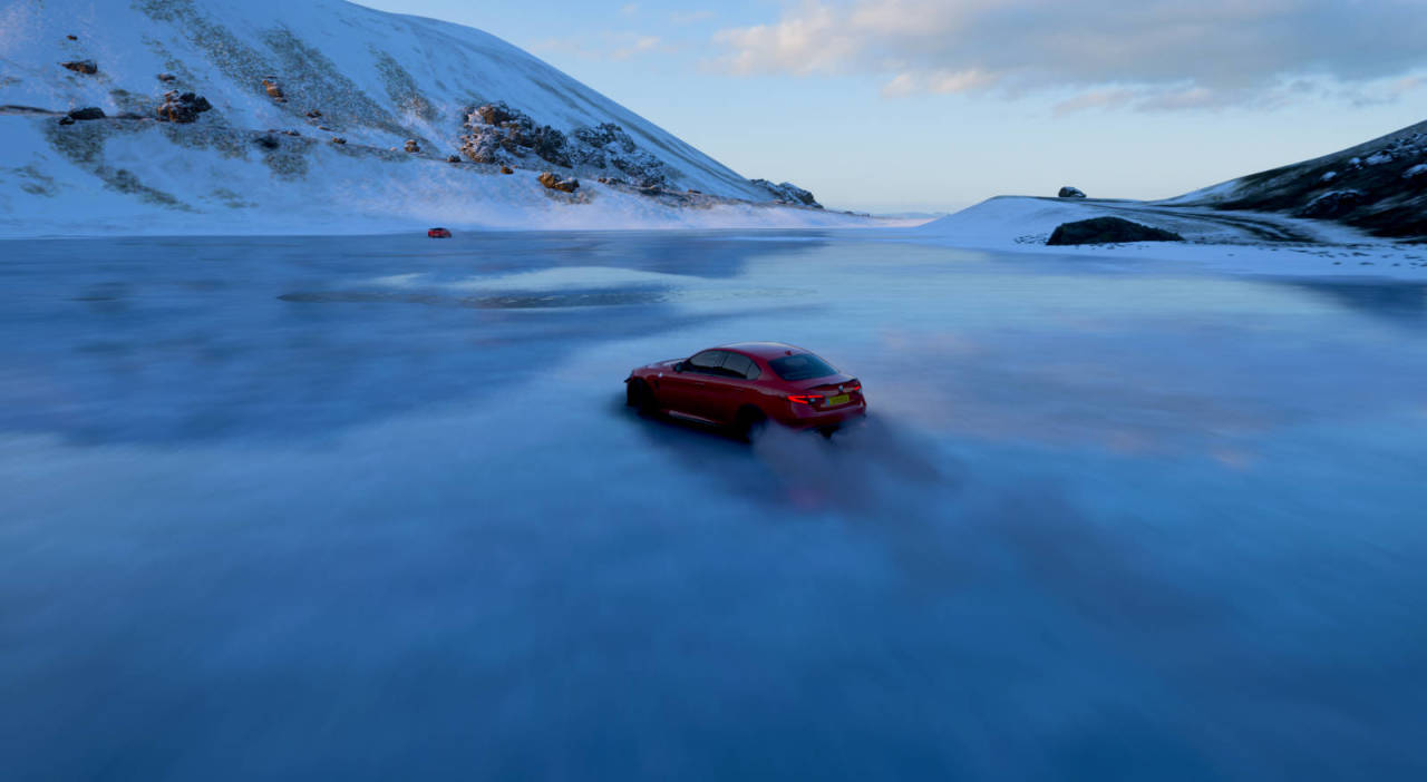 在大火山口的冰湖處拍攝任意阿爾法·羅密歐(製造商英文名:ALFA ROMEO),位置如圖,完成獎勵爲“橙色套裝”服飾獎勵