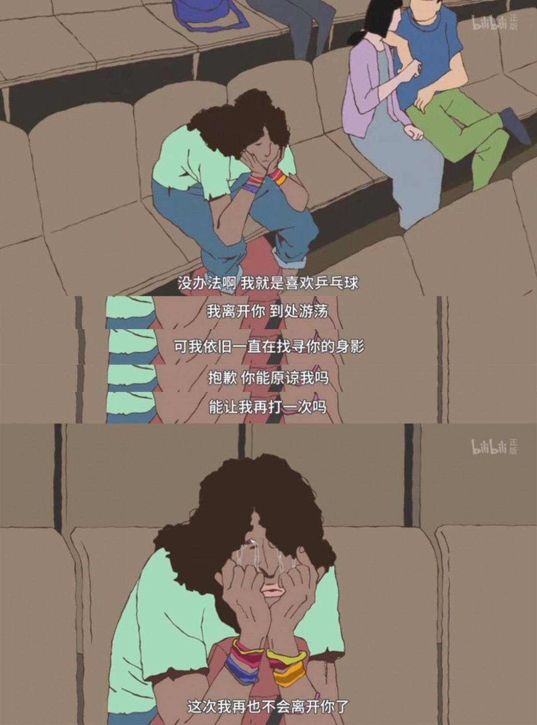《乒乓》有个人气角色“看海哥”,他就属于没天赋还打得菜的人。但决心切割乒乓球后,他在外爬山、看海,找了一圈人生,然后丢了魂。直到重回球场才明白,只有乒乓球最能令他感到充实和开心。
