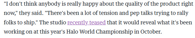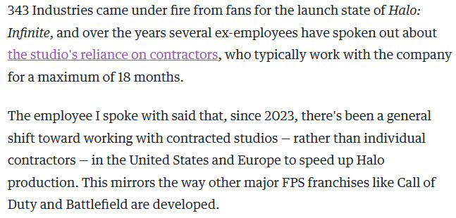 但更名帶來的樂觀氛圍早已消散。開發者透露當前工作室氛圍緊張,某項目近期陷入"危機狀態":"沒人對當前作品質量滿意,管理層不停打氣動員,但大家根本提不起勁。"光環工作室已採用類似《戰地》和《使命召喚》的外包開發模式,將部分工作交由支持工作室以加速進度。