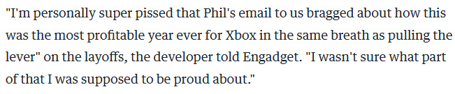 "菲爾·斯賓塞在郵件裏一邊吹噓這是Xbox最賺錢的時期,一邊拉下裁員閘門,這讓我憤怒至極——真不知道我們該爲哪部分感到驕傲。"開發者向Engadget表示。去年343 Industries更名爲光環工作室時,曾宣佈將採用虛幻引擎5替代自研Slipspace引擎開發新作,並確認有多款遊戲正在開發中。