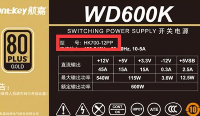 以航嘉为例,航嘉现在电源对外的型号都是按照额定功率标注的,例如WD6000K,但是内部产品型号会在额定的基础上+100,比如WD600K(额定600W)的小型号是HK700-12PP,鑫谷GP600G其实额定是500W等等。图上的直流输出+12V、+5V、+3.3V指的是每根线材输出的电压(例如CPU需要+12V电压、主板需要+12V、+5V、+3.3V、-12V、+5Vsb等等)底下的最大输出,指的是在该电压下输出的最大功率,计算方式是 电压 V(伏特)* 电流A(安培),比如+12V*45A 等于540W的最大输出功率,最大不能超过这个功率,否则可能会烧坏设备!看起来很复杂,你只需要关注+12V这一项参数就好了,其他几种电压基本上冗余很大,我们一般用不到上限,不用管,实在懒得计算功率的,直接看额定输出功率就好,一般整机功率增加50-100W即可大幅度提高稳定性。