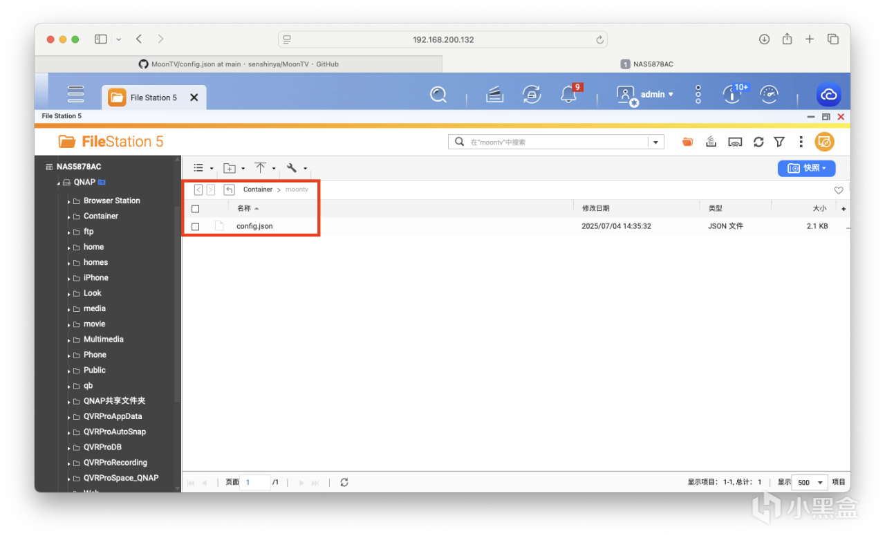 再準備文件目錄,我的具體路徑爲/share/Container/moontv,將上面的文件傳到NAS。