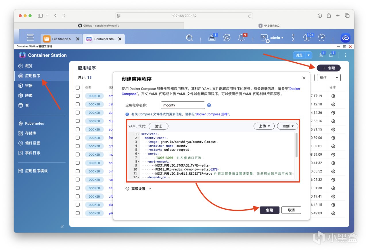 打開Container Station,將代碼粘貼進框內修改後創建項目。