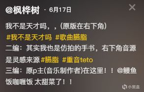 但問題很快出現,在瘋狂的傳播中,原作的存在感逐漸被稀釋。抖音和小紅書上出現的「我不是天才嗎」挑戰潮中,相當一部分視頻並未標註音樂出處或原作者。