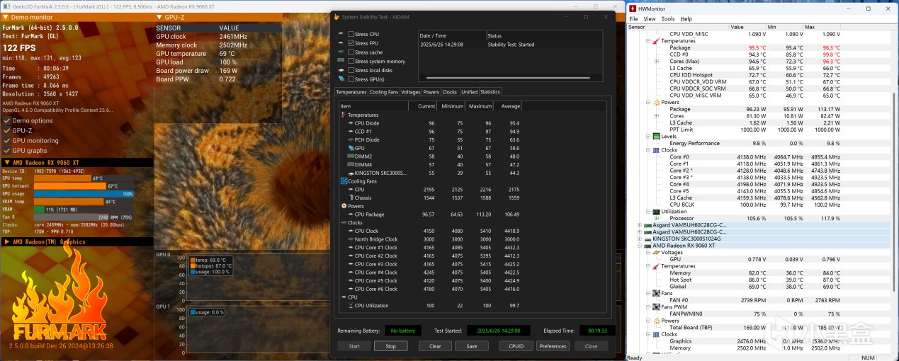 能明显在尾部风扇处感觉到发热,排热效果还是比较明显,也不存在过热严重降频的可能性,整体运行情况我还是比较满意的。毕竟双烤这种极限的功耗,一个大学生,应该暂时也遇不到。如果想在功耗和噪音上再改良,可以再在PBO选项当中做调整。