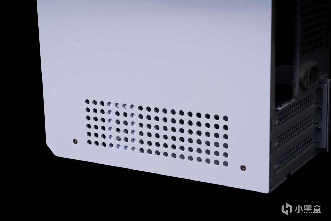 为辅助显卡进气,背板也做了圆孔。感觉可以更激进一点,用前面板的挖孔+防尘网效果会更好一些。