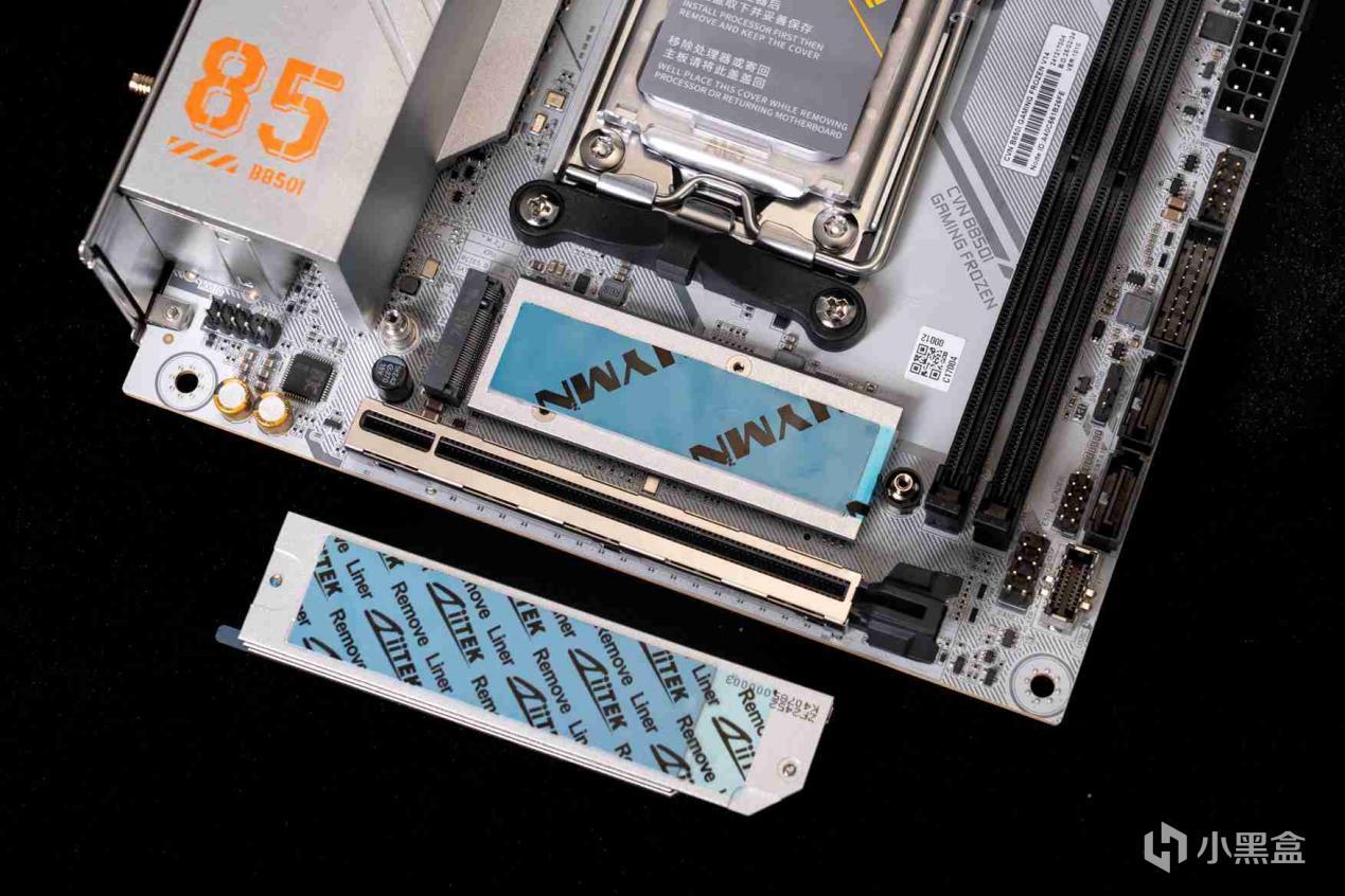 CPU直连的PCIe 5.0 x4 M.2接口,散热装甲的规模不小。两边螺丝做了防丢设计,拧不脱,针对双面SSD,2280尺寸的硬盘槽还在底部的散热底座上也贴了导热贴,按需使用。