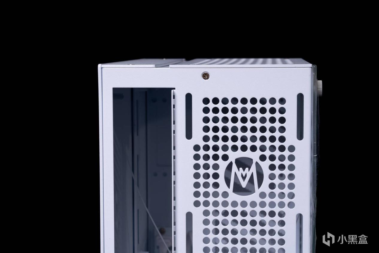 顶部则是可调整安装位置的9CM风扇安装位,中间有机械大师的MM LOGO。