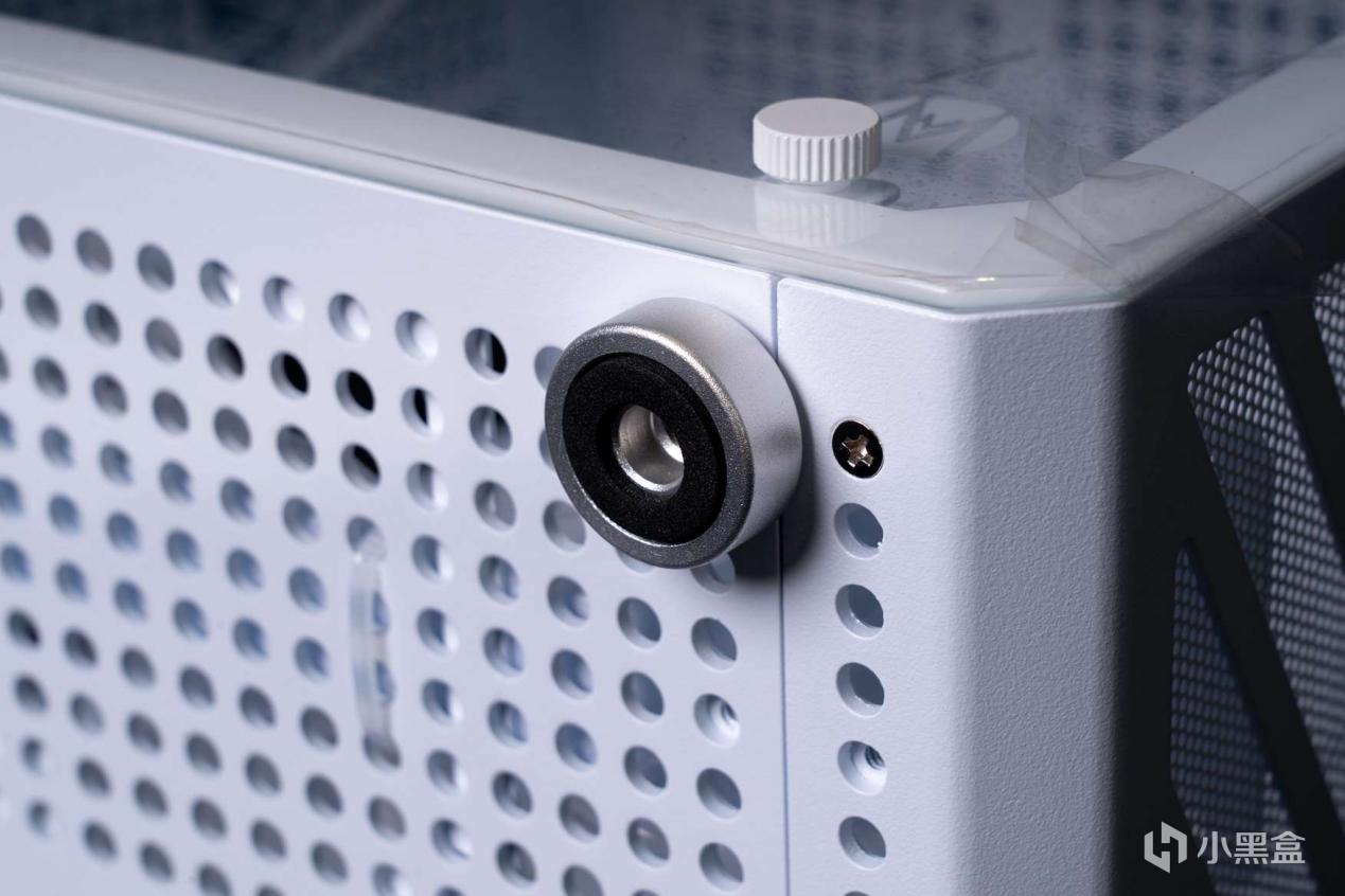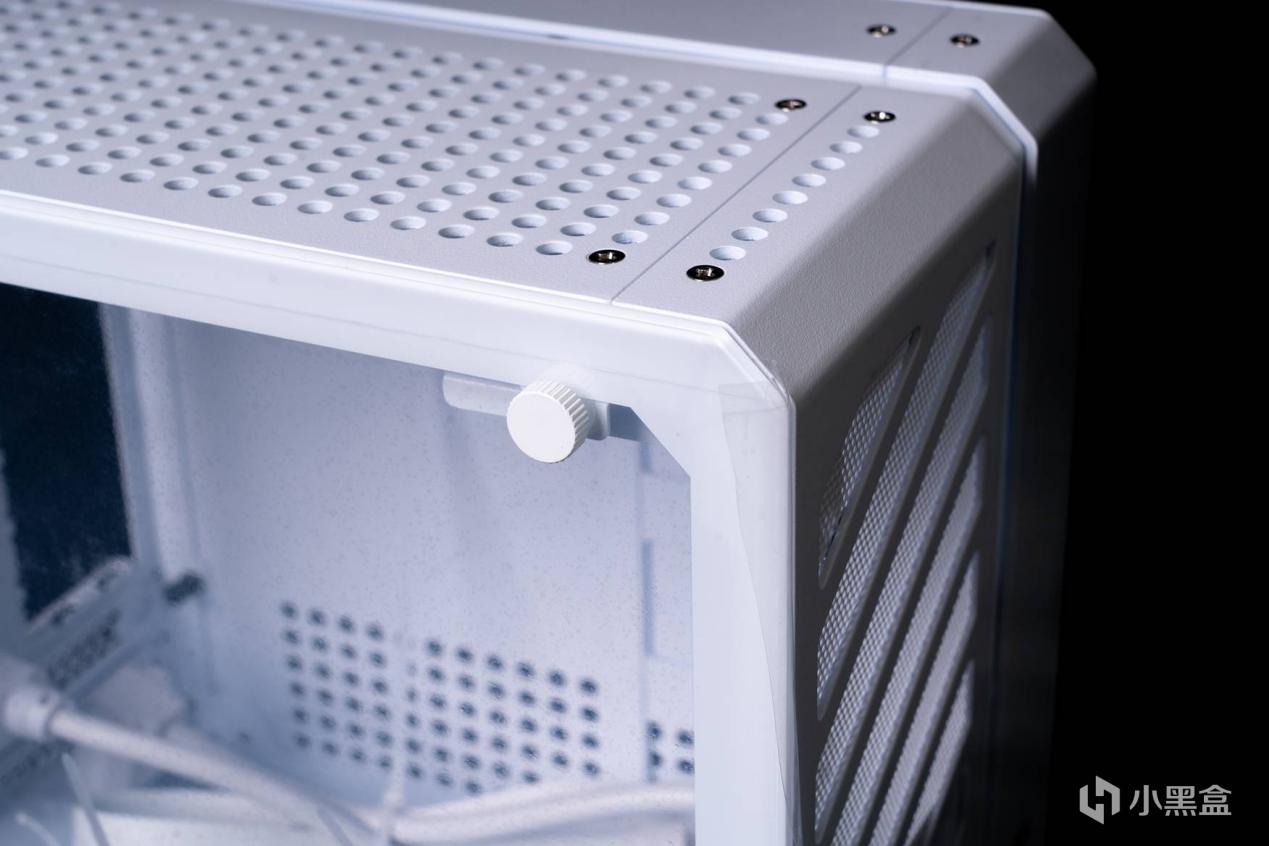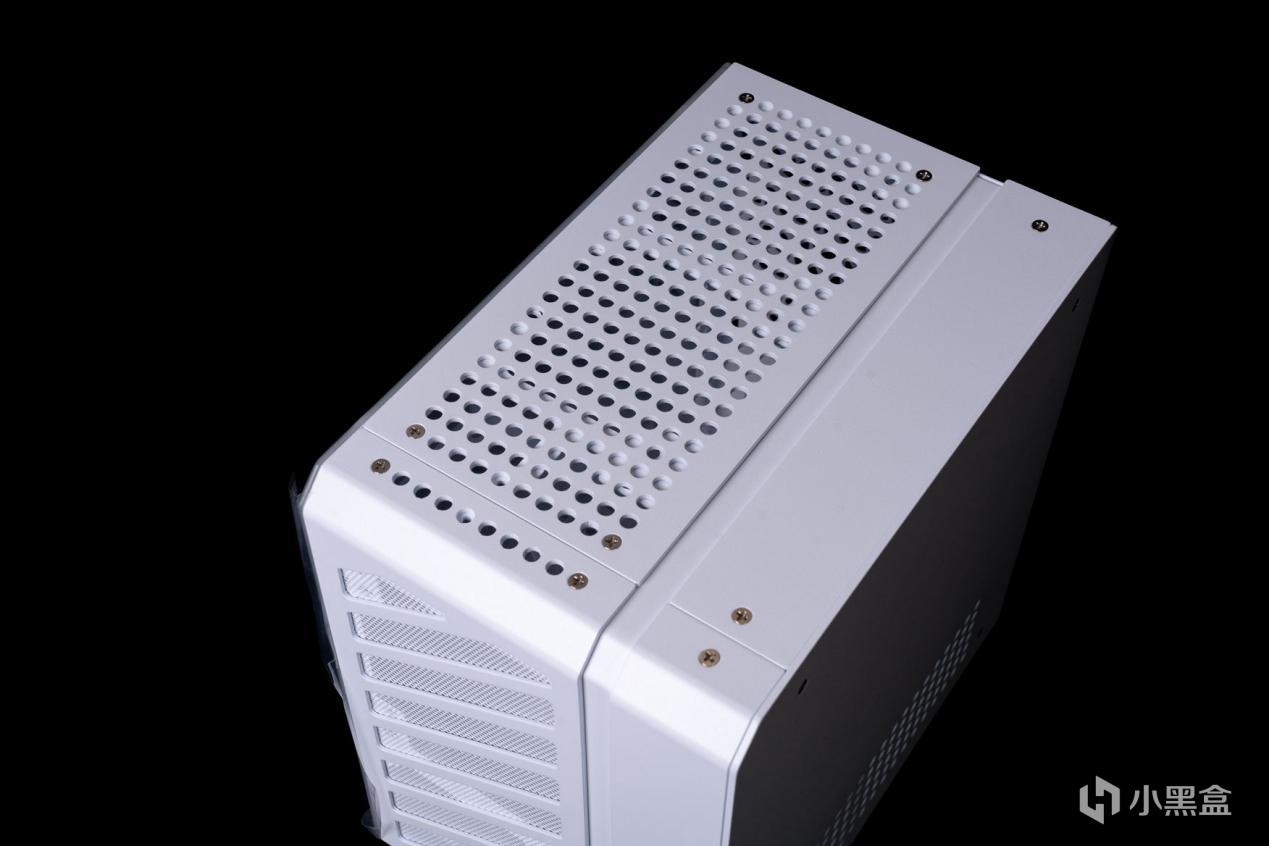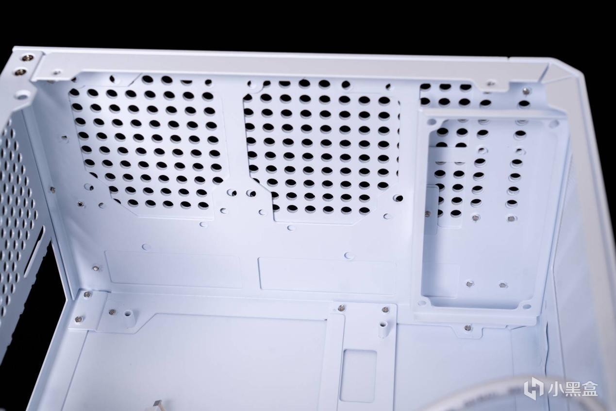 顶盖在内层可以安装双8CM风扇的情况下,外层也留下了均匀的圆形开孔,值得注意的是,中间第5排的首尾两端开孔位置可以用长螺丝来安装提手,设计就是体现在细节里。