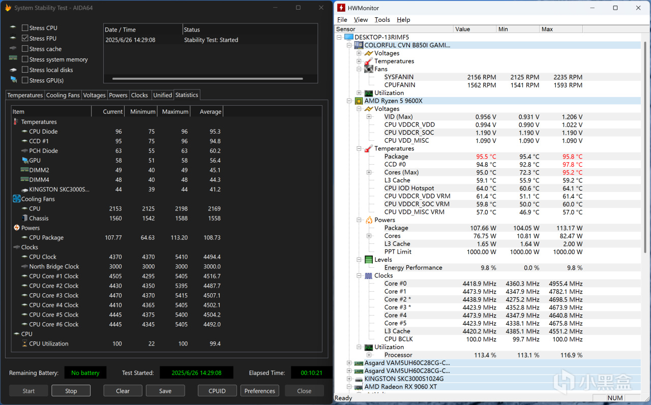 单烤10分钟,CPU供电持续稳定在110W左右,温度95度,全核主频在4.5GHz。这里可见七彩虹CVN B850I的堆料也确实是用在了正地方,相信换个9700X/9800X3D,只要散热得宜,也同样没问题。