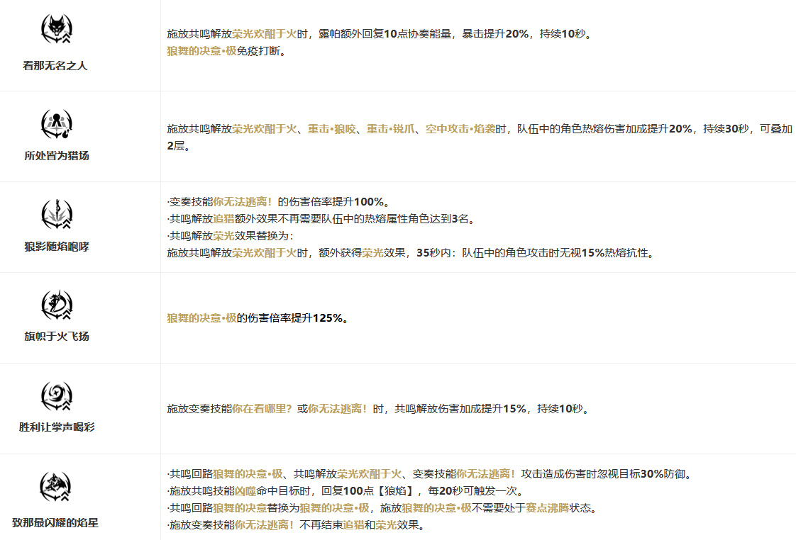 6链完整版主C露帕各种爆发技能都直接无视30%敌人防御高额穿防,提供一个20秒一次的两点狼魂资源,拉长了露帕的输出轴,让露帕能够站场输出,而且狼舞决意无需处在【赛点沸腾】状态就可以被强化为【极】模式,优化流程再拉一波输出,再加上追猎和荣光效果不再被变奏技能结束,自己拐自己这一块,真是一人成军了~