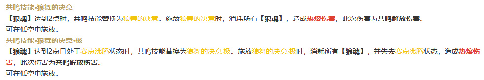 条上的狼头就是狼魂,我们要做的就是打满狼焰然后把狼焰转化为狼头,需要注意的是,狼魂满层时打出的强化共鸣技能【狼舞的决意】被计算为共鸣解放伤害,并且处在热点沸腾状态下狼舞的决意会升级为【狼舞的决意 极】伤害倍率提升极高,赛点沸腾持续时间十二秒,发动强化共鸣技能时最好在热点沸腾状态下进行,注意时间哦~