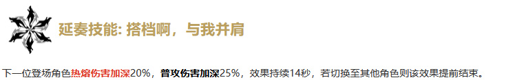 面对4C敌人时热熔伤害提升10%,若全队均为热熔角色额外提升至20%