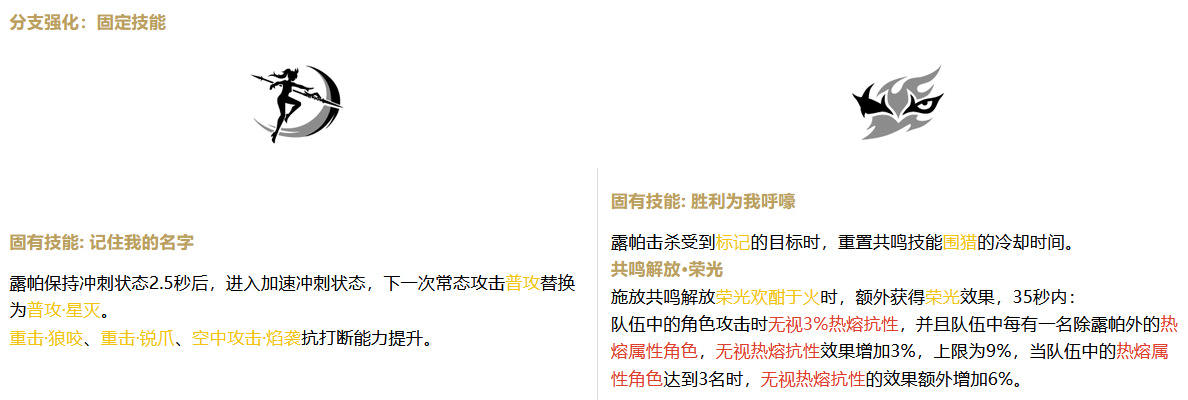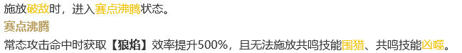 【赛点沸腾】状态此时共鸣回路条的获取效率提升500%,虽然不能使用技能,不过共鸣条获取效率提升后A两下就能攒满回路条,接下来把狼焰通过5A级连招转化为条上的俩狼头,就可以释放强化共鸣技能。