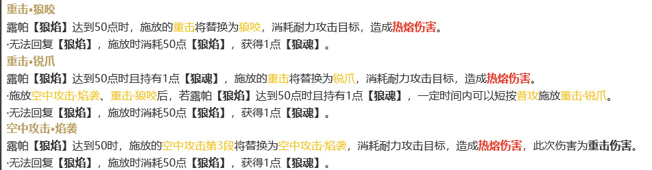 看着很复杂,其实全都是在说通过重击能够将50点狼焰转化为一点狼魂,重击中包括一些特殊规则,空中攻击第三段替换为焰袭,能够直接算为重击伤害计算狼魂,打完焰袭如果还有50点狼焰,通过焰袭后的第一次普攻再计算一次狼魂,简单来说,空中第三击自动换为重击,重击转化一点狼魂,重击后一次普攻再转化一次,我们就能只靠平A丝滑的获得两点狼魂啦。