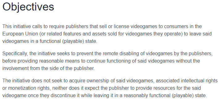 本倡议要求向欧盟消费者销售/授权游戏(或其运营游戏内售卖的要素)的发行商,必须保证这些游戏处于可运行状态。具体而言,倡议旨在阻止发行商远程禁用游戏功能,除非已提供不依赖发行商即可维持游戏运行的合理方案。