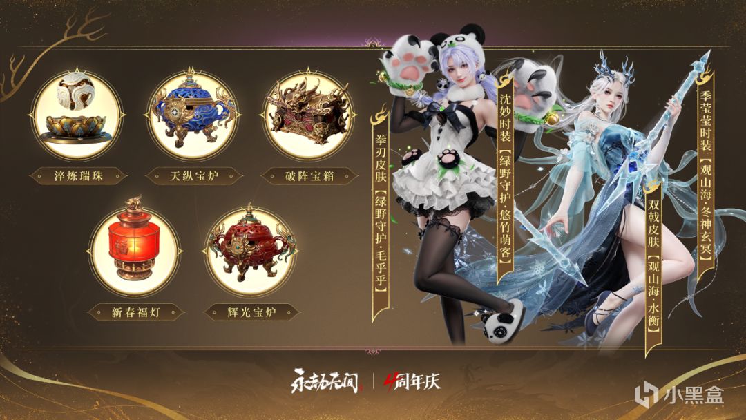 週年慶期間,輝光寶爐淬鍊瑞珠天縱寶爐破陣寶箱新春福燈將限時返場,還有季瑩瑩時裝【觀山海·冬神玄冥】、拳刃皮膚【綠葉守護·毛乎乎】、雙戟皮膚【觀山海·水衡】等熱門外觀均以直售形式直接返場。