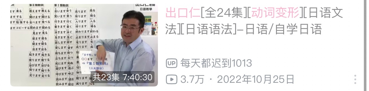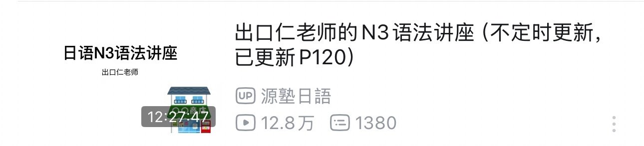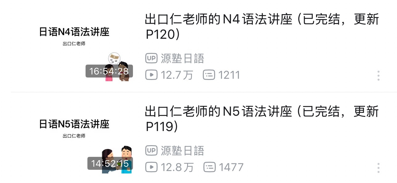 A:如文中说的,我个人看的最多,对我帮助最大的是出口仁老师的视频,从入门贯穿到N1,他还有很多其他教学视频我没有列出,但是都是很好,b站上也有搬运。还有周业繁,hero3046都是我看过的很好的老师!