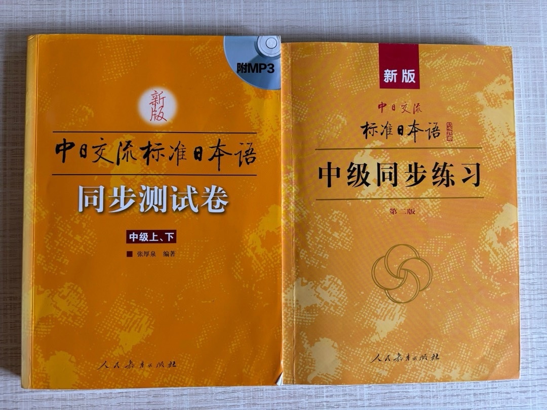 细说一下上图两本练习册吧。图右是中级同步练习,相对简单,题目也大多是巩固基础知识,不是jlpt的题型。图中左边的同步测试卷,题型比较的标准,分词汇语法阅读听力等,比较像jlpt的题型,比较地贴合学的本课内容,但是会偏难,偶尔会有超纲的题目,第一次做阅读的时候真的很震惊,因为当时真的感觉很难,但是还是坚持做了,从做题到对答案,再到弄懂不会的可能要花三个小时,但是做这个练习题让我进步很大!不过那时候还没有GPT之类的,现在有了很多题和语法也可以问,可能会舒服一点。