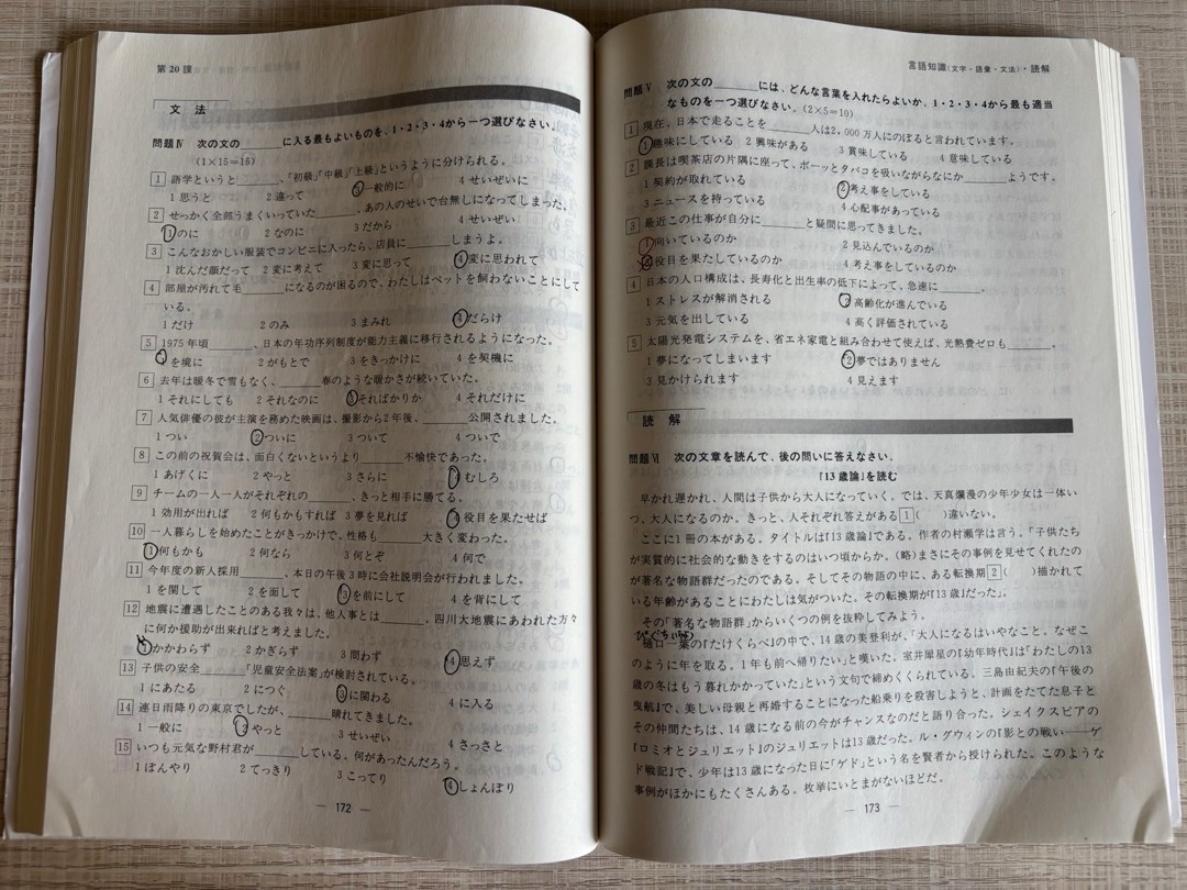 标日高级的教材不再有会话部分了,而是直接上长篇课文,难度比N2又要大了很多,语法点和要背的词汇也多了很多,学习周期也拉的很长,因为学高级课本的时候我上大一,时间多了很多,相对高强度地学了七八个月,完成了课本学习,在课本后有个模拟N1题,我当时做了140左右。