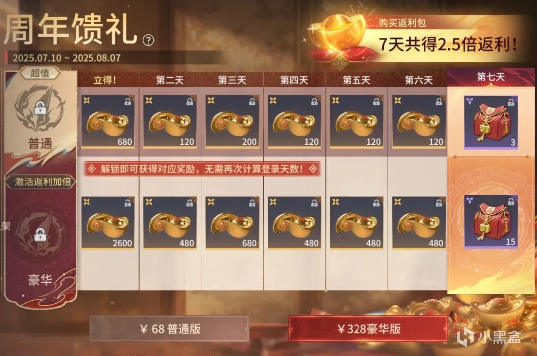 充值68元可领1360元宝+盛放宝箱任选礼x3;充值328元可领6560元宝+盛放宝箱任选礼x18,这波羊毛,记得10号来薅~