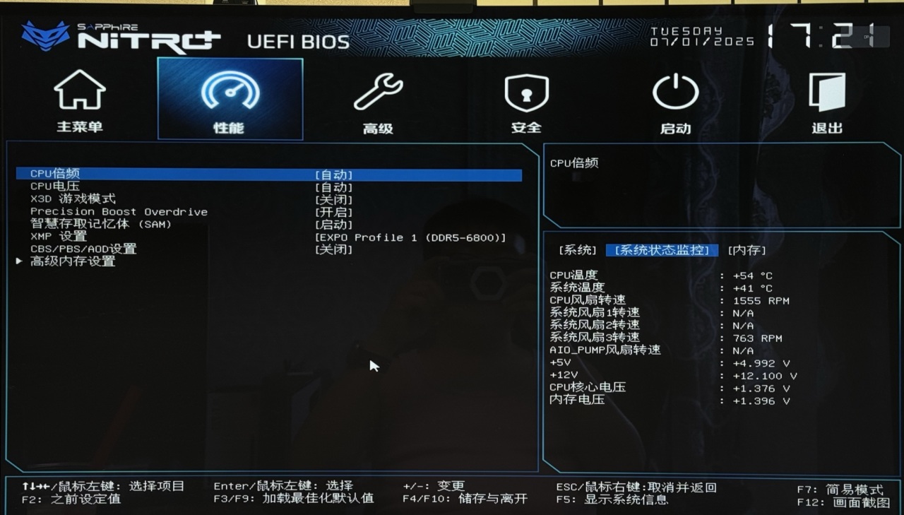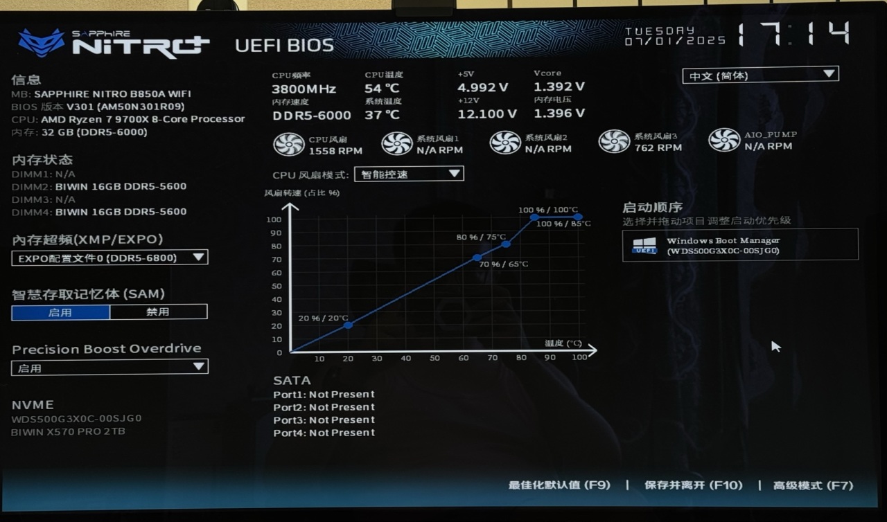 蓝宝石NiTRO+氮动B850A WIFI的BIOS界面采用与主板、包装一致的赛博朋克风格,兼具视觉统一性与操作友好度。我觉得它的BIOS系统算是很成熟了,即使在简易模式就能完成核心功能调控——
