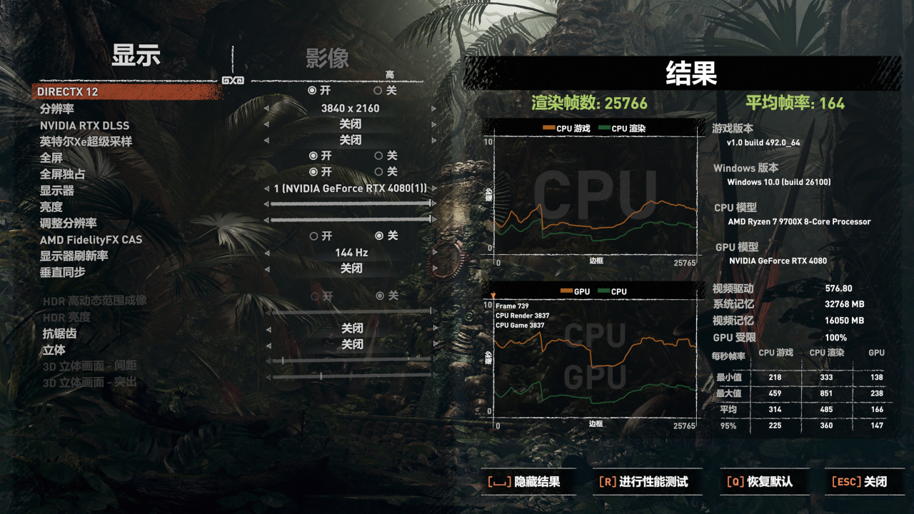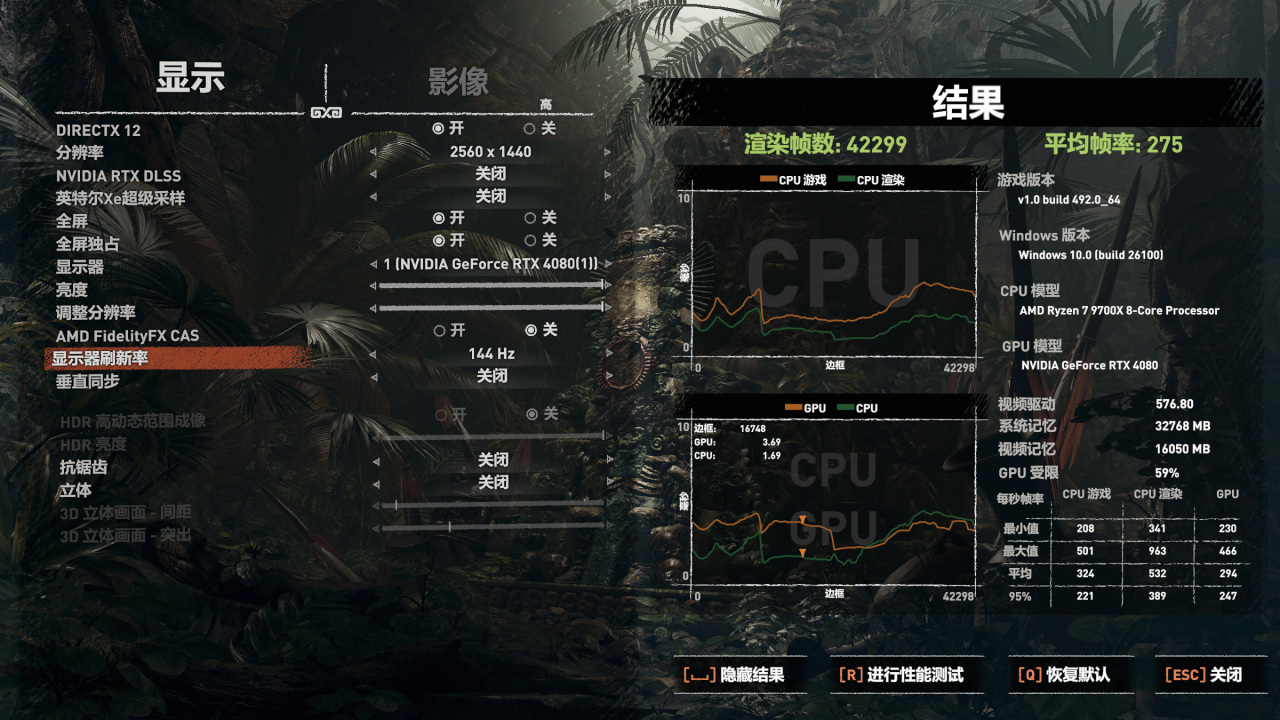 同时,我们也能注意到CPU游戏平均帧314,CPU渲染平均帧485,在这个游戏里,CPU性能尽显!而显卡弱了,性能没跟上。