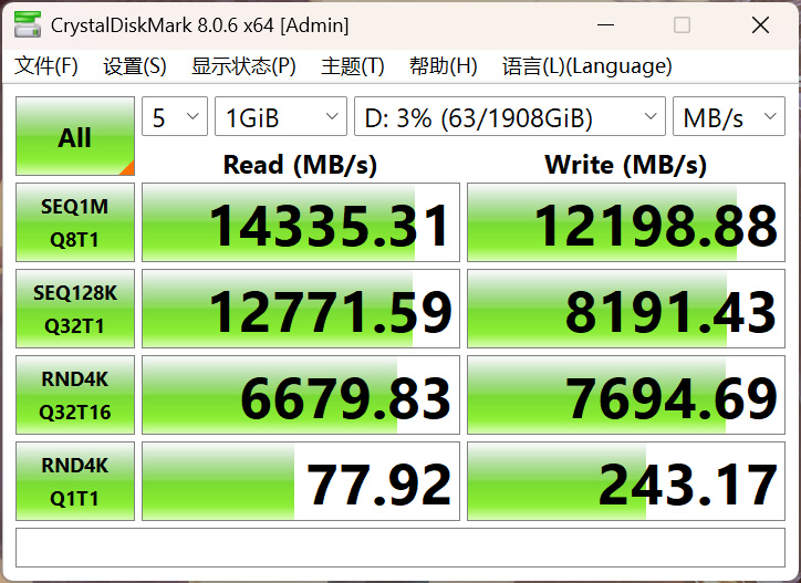 实际测试数据如上,可以跑出14335MB/s的读速和12198MB/s的写速,已经超过了这块主板的官方标称值(约10GB/s),蓝宝石氮动主板的PCIe 5.0固态硬盘接口的带宽给的还是相当足的。