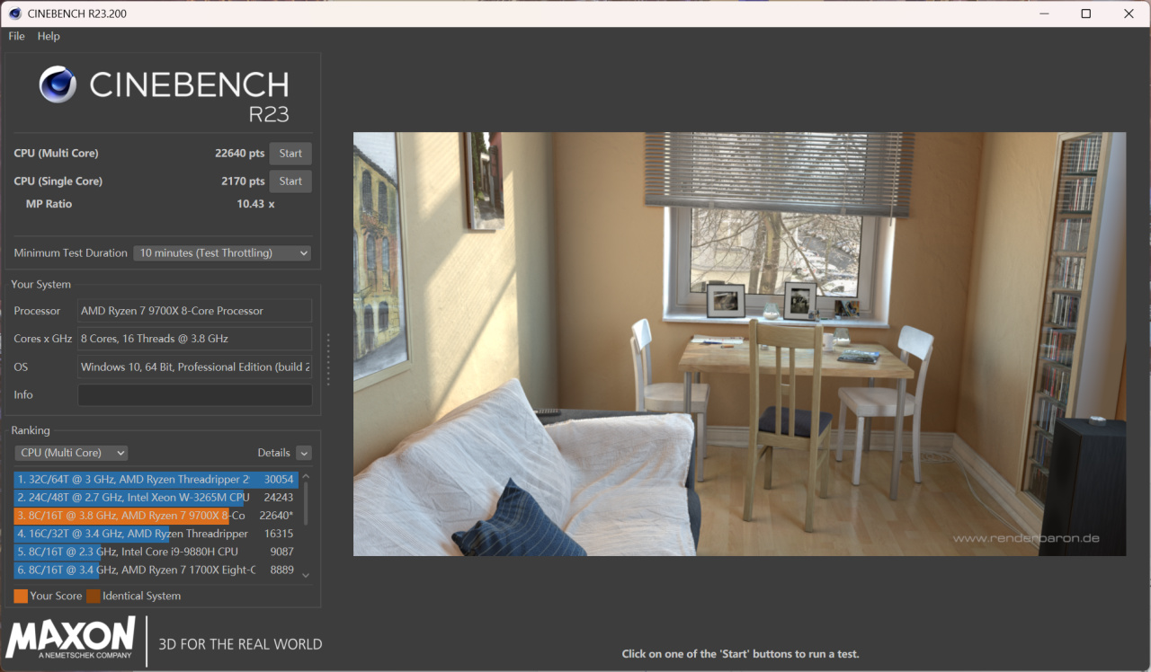 在CinebenchR23中,9700X配合氮动B850A,单核跑分2170,多核跑分22640。成绩和我的冰雕跑出的单核2171,多核22455相当。