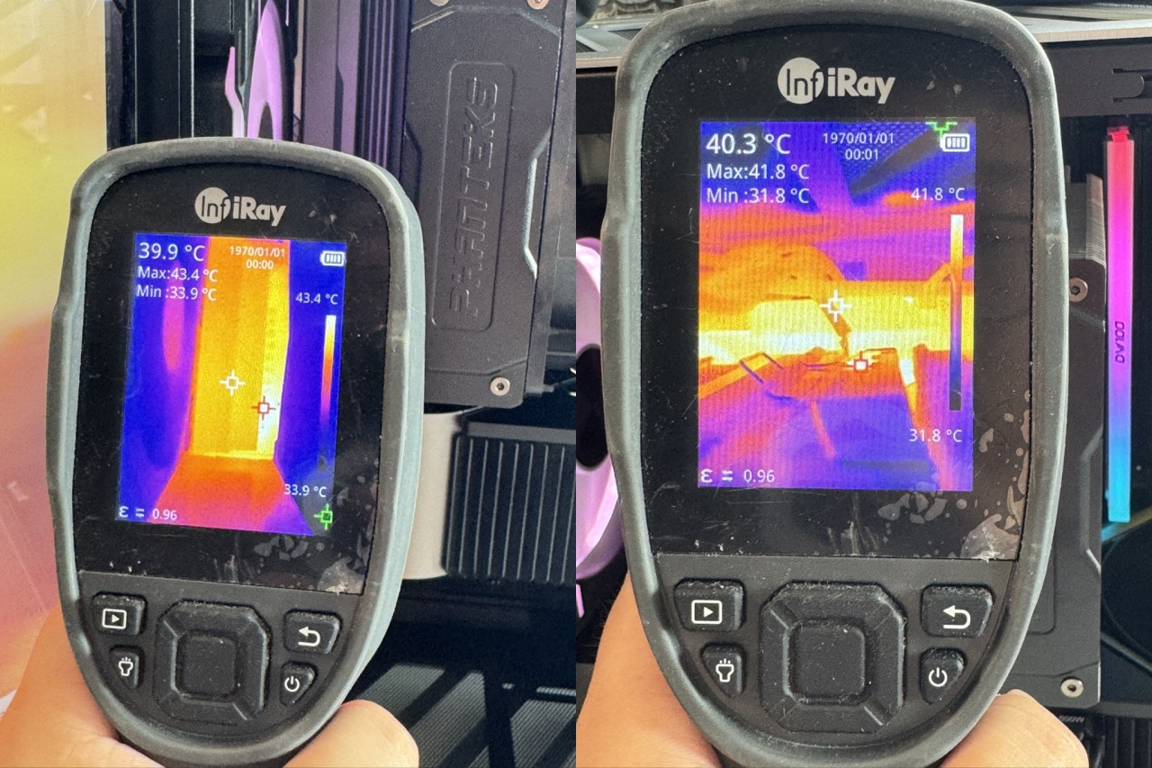 另外,我发现在烤机、跑测试的时候,主板供电的金属散热模组,温度控制在了40摄氏度左右(室温28),而且表面热度分布很均匀,这个真的太稳了!