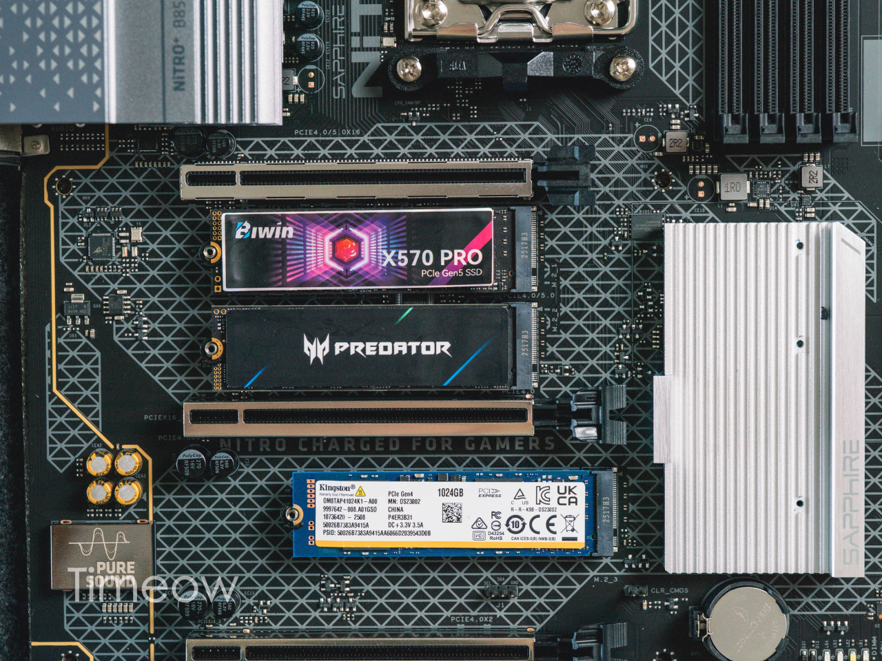 它的固态硬盘M.2口给了3个,且包含一个PCIe5.0的通道,实测可以轻松跑满14GB/s的满血Gen5固态,而其他两个都是传统的PCIe4.0,支持旗舰级PCIe4.0固态,对于绝大多数玩家来说妥妥够用。
